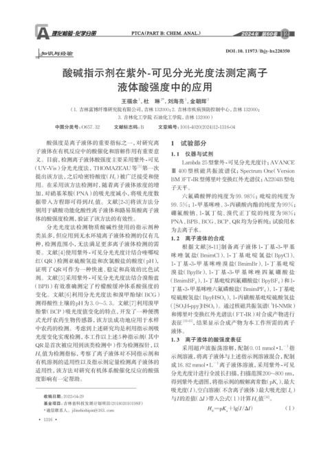 义。目前,检测离子液体酸强度主要采用紫外-可见