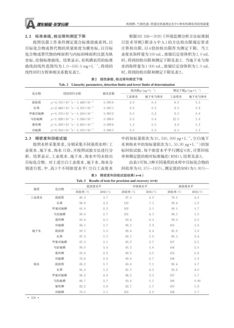 目标化合物。对上述空白工业废水、地下水、海水分 由表3可知,种不同基质的水样中目标化合物的