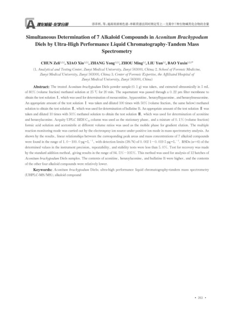 Abstract: The treated Aconitum brachypodum Diels powder sample (0. 1 g) was taken, and extracted ultrasonically in 5 mL