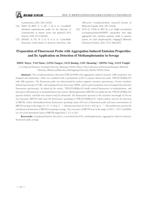 周欣雨,等:聚集诱导发光特性的荧光探针的制备及其在检测污水中甲基苯丙胺的应用