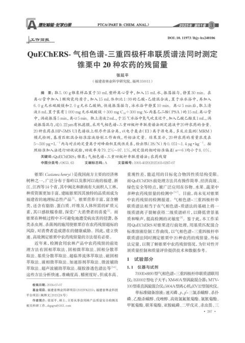 关键词: QuEChERS;锥栗;气相色谱-三重四极杆串联质谱法;农药残留