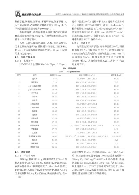1. 2 仪器工作条件 电离能量 70 eV。数据采集模式为多反应监测