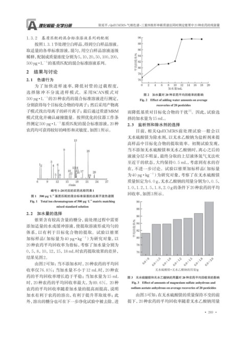 时,20种农药的平均回收率最大,为89. 6%。20种 Fig. 3 Effect of amounts of magnesium sulfate anhydrous and