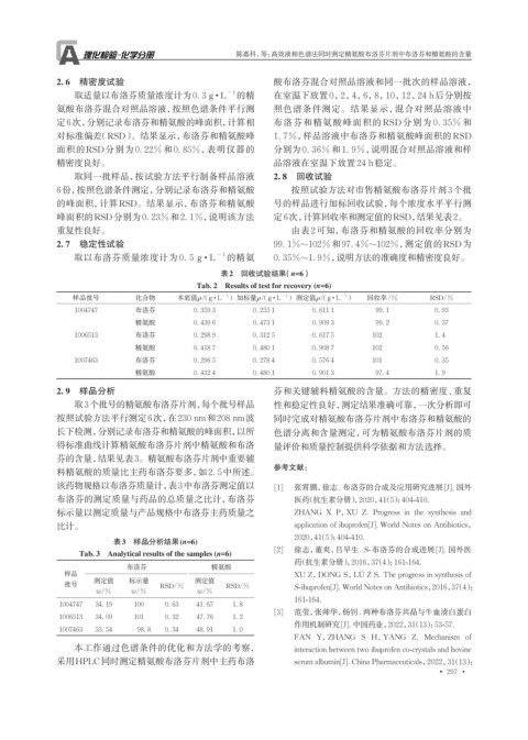 取以布洛芬质量浓度计为 0.5 g·L − 1 的精氨 0. 35%~1. 9%,说明方法的准确度和精密度良好。