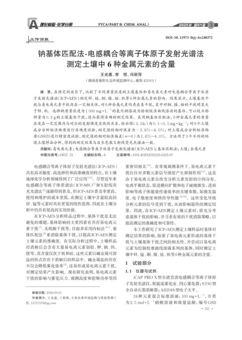 子发射光谱法(ICP-AES)测定锌、锰、铜、镍、钴、钒等6种金属元素的影响。结果显示,土壤基体干
